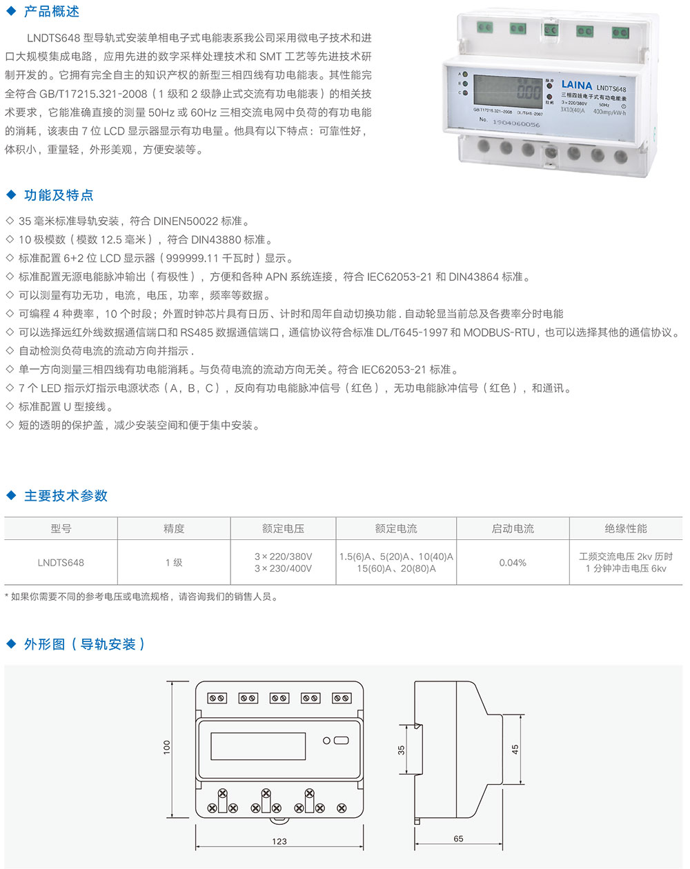LNDTS648 型导轨式安装单相电子式电能表系我公司采用微电子技术和进口大规模集成电路,应用先进的数字采样处理技术和 SMT 工艺等先进技术研制开发的。它拥有完全自主的知识产权的新型三相四线有功电能表。其性能完全符合 GB/T17215.321-2008(1 级和 2 级静止式交流有功电能表)的相关技术要求,它能准确直接的测量 50Hz 或 60Hz 三相交流电网中负荷的有功电能的消耗,该表由 7 位 LCD 显示器显示有功电量。他具有以下特点:可靠性好,体积小,重量轻,外形美观,方便安装等
