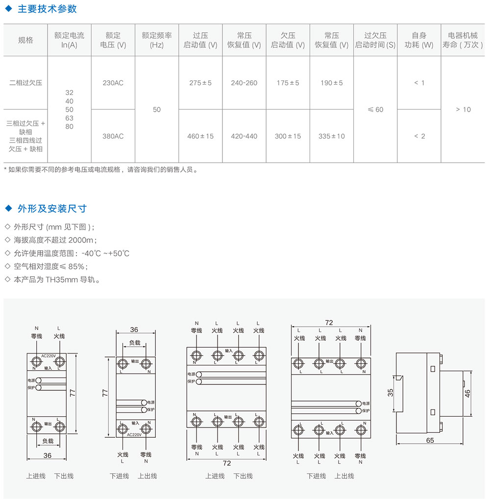 自复式全自动过欠压延时保护器是我公司根据目前市场所研制的新一代家电保护装置。保护器由电子电路组成,采用模数化标准生产,性能优良、可靠。能在电压异常情况下正常工作。当市电电压超过保护器动作电压时,保护器能迅速、可靠地切断电路,以达到保护家用电器的安全。当市电电压恢复正常时,保护器能自动接通电源、恢复供电,所有功能全部自动实施、无需人员操作。面板上的双色发光二极管能指示保护器工作状况。指示灯发绿光时正常供电,发红光时保护功能启动切断供电。本系列产品结构紧凑、外观美观、安装与 DZ47(C45) 导轨通用。